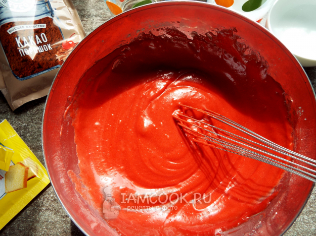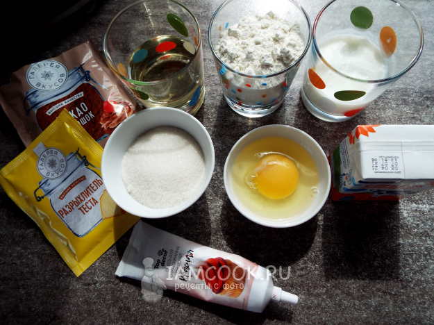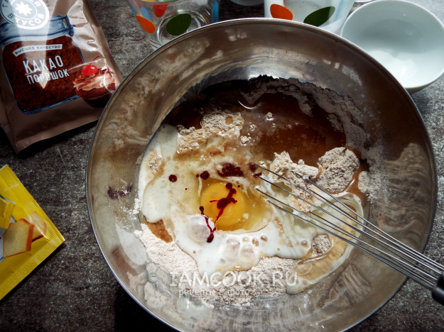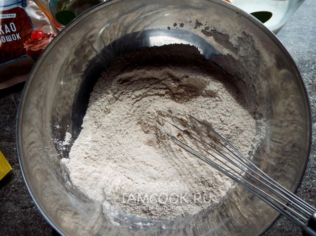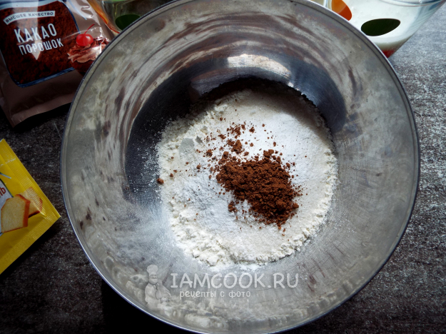 В миске смешать сахар, муку, разрыхлитель и какао.