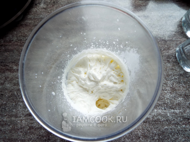 Холодные сливки взбить с сахарной пудрой до устойчивых пиков.
