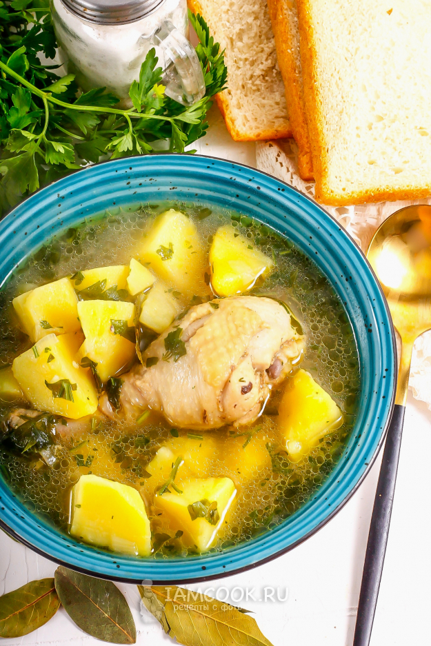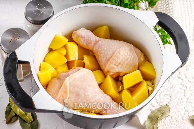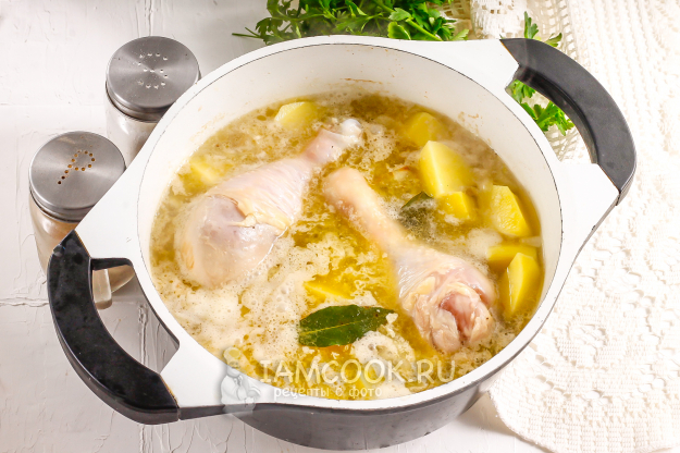 Затем всыпьте в емкость соль и молотый черный перец, лавровые листья. По желанию можете добавить и приправу для курицы. Влейте горячую воду и доведите содержимое емкости до кипения. Удалите образовавшуюся пену, стараясь не удалить вместе с ней и жир на поверхности. Отварите все на умеренном нагреве примерно 35 минут, не забыв проколоть голени, чтобы они не остались сырыми внутри. Можно использовать любую часть куриной тушки по вашему желанию.