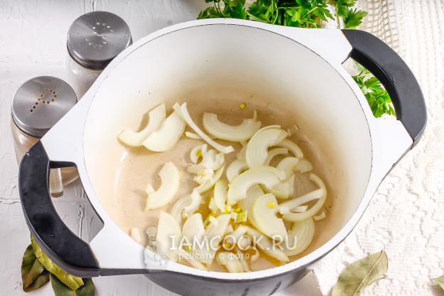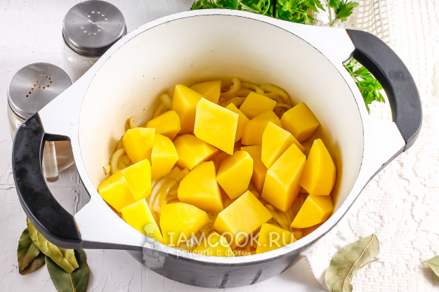 Очистите лук и картофель от кожуры и промойте в воде. Нарежьте лук полукольцами, а картофель - средними кубиками. В казан выложите сливочное масло и луковую нарезку. Обжарьте примерно 3-4 минуты до мягкости.