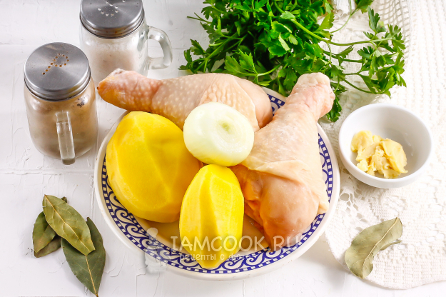Возьмите необходимые ингредиенты для приготовления аппетитного супа Бозартма из курицы по-азербайджански.
