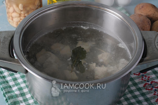 Сложить мясо в кастрюлю, налить фильтрованную холодную воду и поставить на огонь. Довести мясо до кипения, собрать образовавшуюся пену. Воду посолить, добавить перец горошком и лавровый лист и варить мясо 35-40 минут.