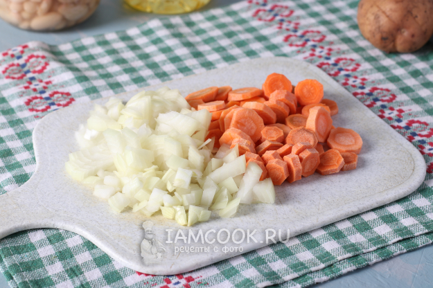 Почистить лук с морковью, нарезать лук кубиками, а морковь - как вам нравится: соломкой, кубиками или просто натереть на тёрке.