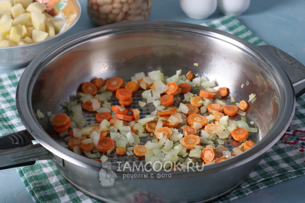 Разогреть в сковороде масло, немного обжарить лук с морковью, до мягкости. Почистить и нарезать кубиками картофель.