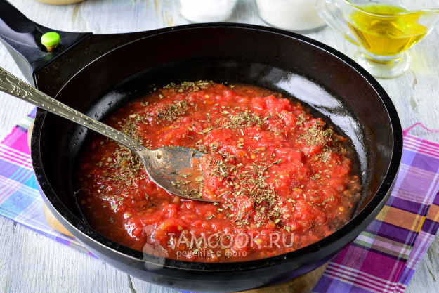 Пока тесто расстаивается, приготовьте соус и начинку. Влейте немного оливкового масла на сковороду, добавьте томатное пюре и прованские травы. Уваривайте соус 7-8 минут на небольшом огне. Соус можете слегка посолить и поперчить по вкусу. Если томатное пюре с кислинкой, добавьте немного сахара, чтобы отрегулировать вкус.