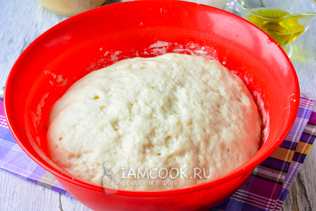Тесто выросло почти в 3 раза, а значит пора печь пиццу. Тесто обомните руками.
