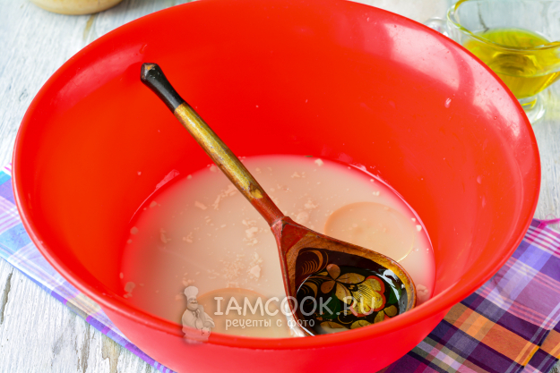 Раскрошите в теплую воду и сырые дрожжи, размешайте жидкость.