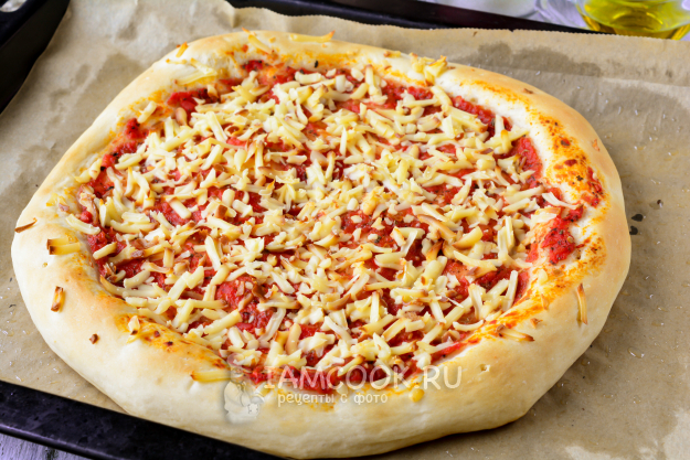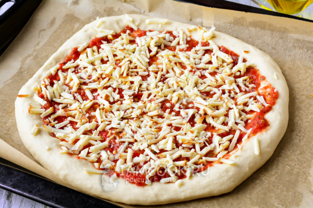 Раскатайте тесто так, чтобы по краю остался пышный бортик, а серединка было тонкой. Выложите тесто на противень. Для удобства раскатывайте тесто сразу на пергаментной бумаге. Смажьте пиццу томатным соусом.