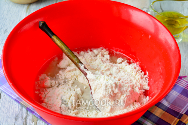 Добавьте в тесто понемногу просеянную муку и начните перемешивать.