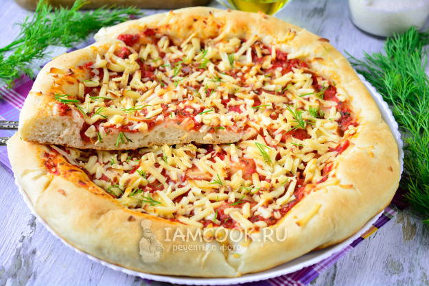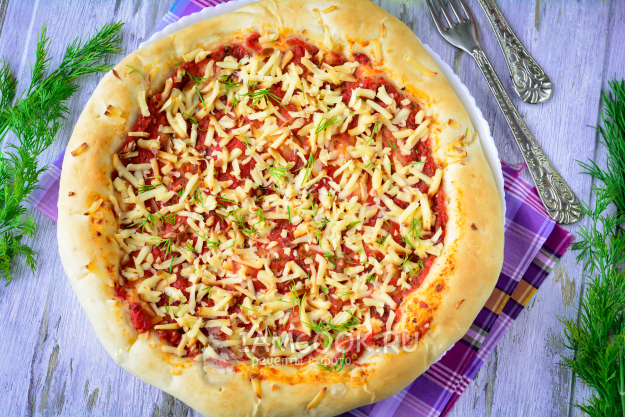 Присыпьте пиццу колбасным сыром и отправьте в разогретую духовку.