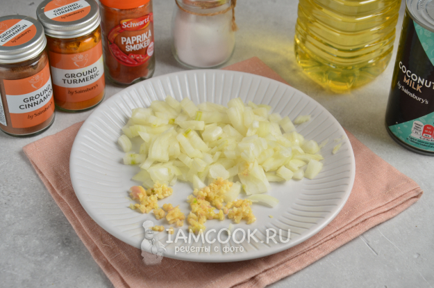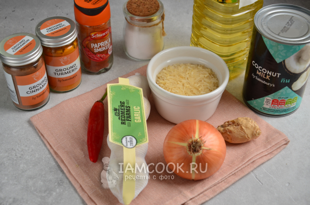 Подготовьте все необходимые продукты для острого карри с рисом. Сразу же поставьте вариться рис в подсоленной воде.