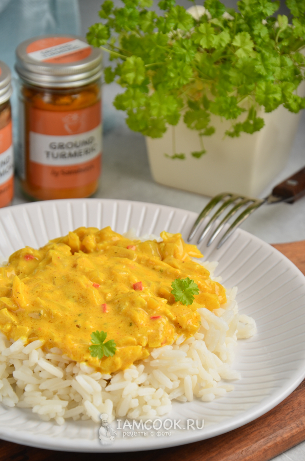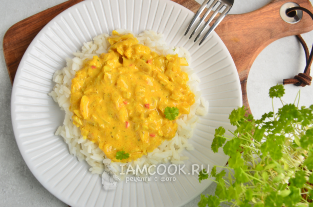 Далее выложите на тарелку вареный рис, а сверху полейте ароматным соусом.