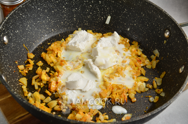 Добавьте кокосовое молоко. В моем случае оно затвердело в банке и в таких случаях я просто подогреваю его в микроволновой печи, чтобы вернуть в жидкое состояние. Здесь же можно просто положить в сковороду - растает самостоятельно. Подсолите.