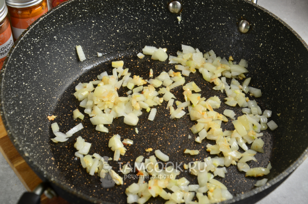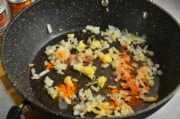 На раскаленном растительном масле в течение 5 минут обжаривайте лук и чеснок, сделав слабый огонь и почти постоянно помешивая.