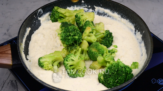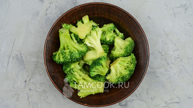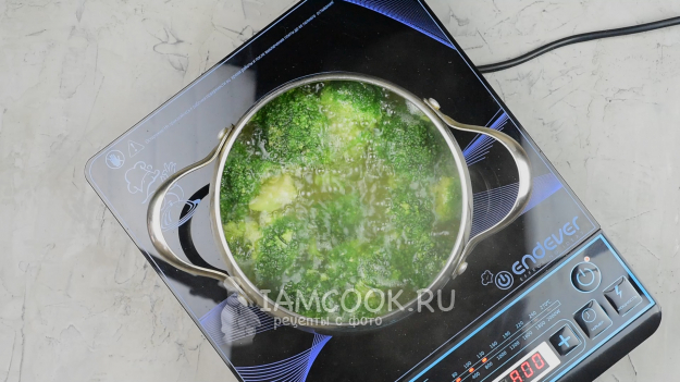 В кастрюлю выложим брокколи и зальем водой так, чтобы все соцветия были покрыты. Поставим вариться до готовности, то есть до мягкости овоща. Проверяйте готовность пробуя, я варила 10 минут с момента закипания жидкости.