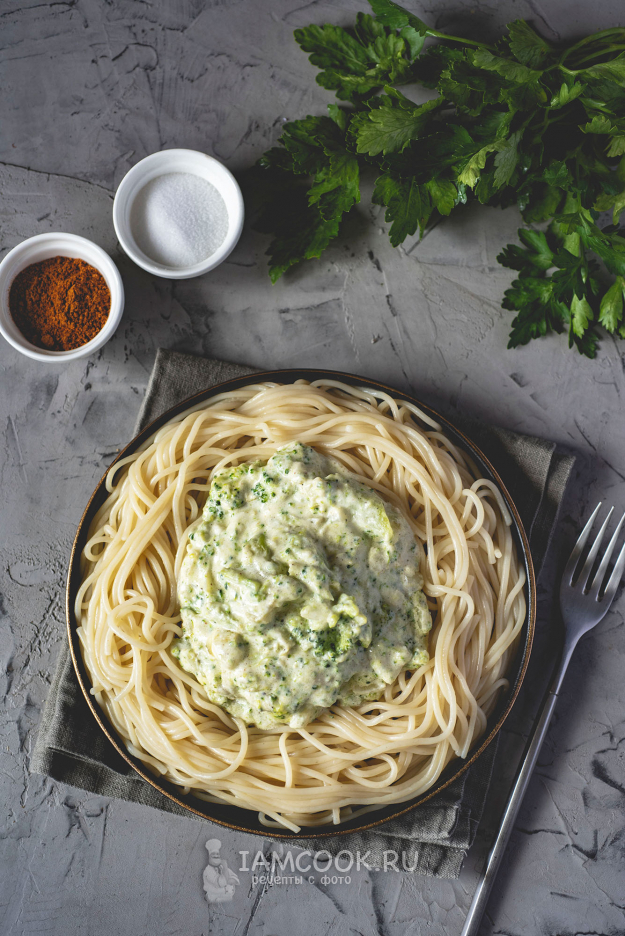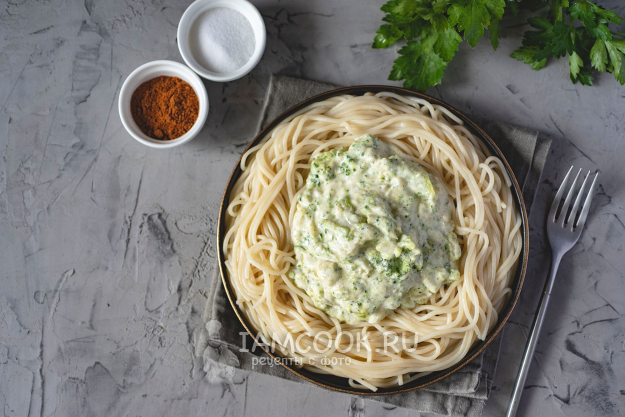 Выложим готовые спагетти/макароны с брокколи в сливочном соусе на порционные тарелки. Подаем сразу же к столу.