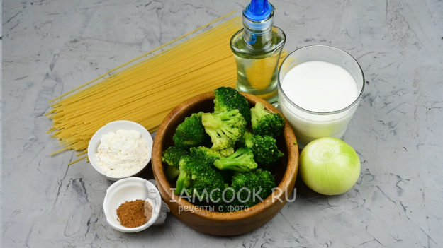 Возьмём необходимые ингредиенты для приготовления макарон с брокколи в сливочном соусе. У меня соцветия брокколи замороженные, поэтому я лишь ополосну их в теплой воде. Если же у вас капуста свежая, то ее следует разобрать на небольшие соцветия и каждое тщательно промыть в проточной воде. В этом рецепте можно использовать любые макароны, я приготовила спагетти. Сливки лучше использовать 20%-ной жирности, так как 10% - это будет жидковато, а больше 20% - тяжело для желудка. Лук сразу почистим.