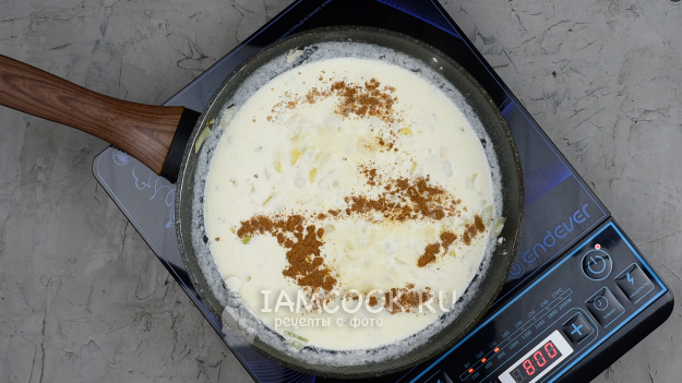 Как соус загустеет, добавим соль и мускатный орех. Обязательно попробуем на вкус. Перемешаем.