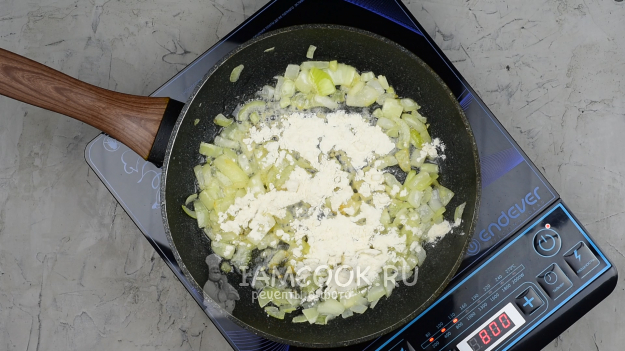 Добавим к луку муку и энергичными движениями лопатки все размешаем.
