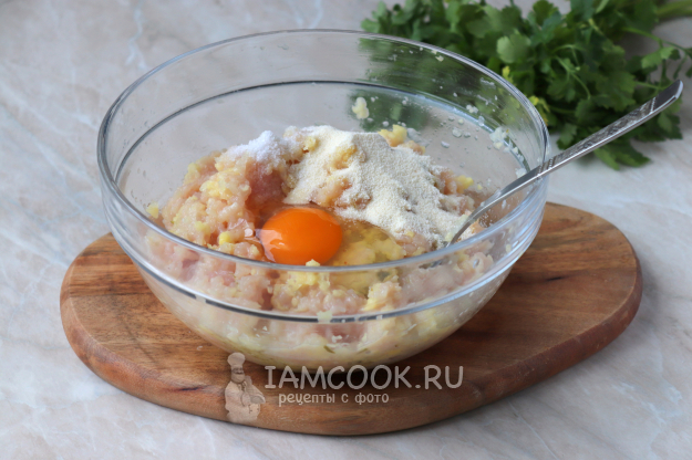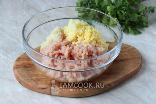 Пропустите через мясорубку куриное филе, лук и сырую картошку.