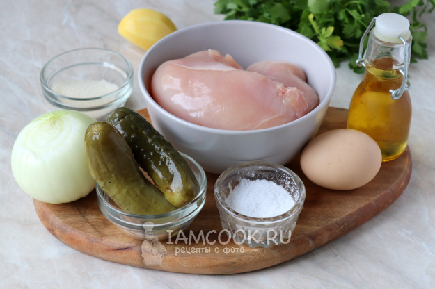 Для приготовления котлет из фарша с солеными огурцами возьмите ингредиенты по списку. Овощи вымойте и очистите. Куриное филе вымойте и нарежьте небольшими кусочками. Вместо куриного филе можно использовать любое другое мясо или уже готовый фарш. Я предпочитаю фарш делать самостоятельно, процесс это несложный и я всегда уверена в качестве продукта.