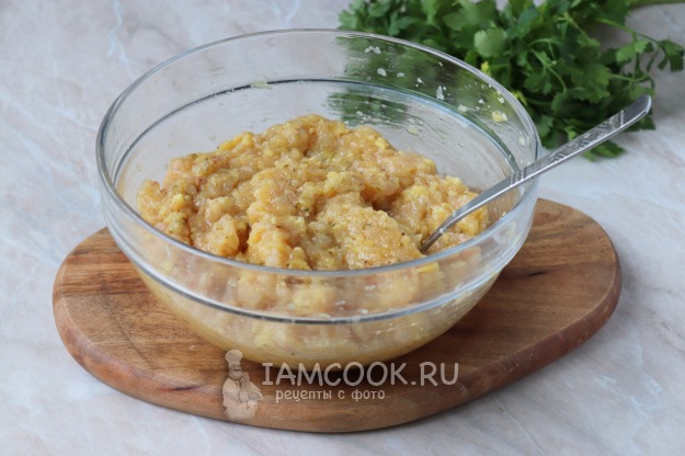 Тщательно перемешайте, чтобы специи равномерно распределились. Накройте миску полотенцем или крышкой и оставьте на 10-15 минут, чтобы манка немного набухла.
