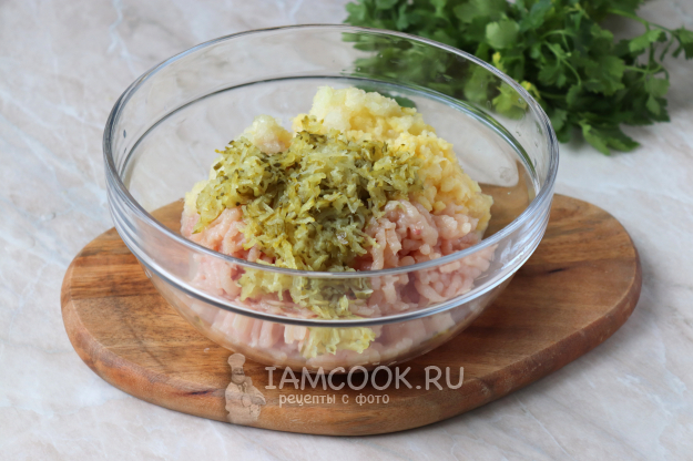 Соленые огурцы натрите на тёрке со средними ячейками, слейте лишнюю жидкость, а получившуюся стружку добавьте в миску с фаршем.