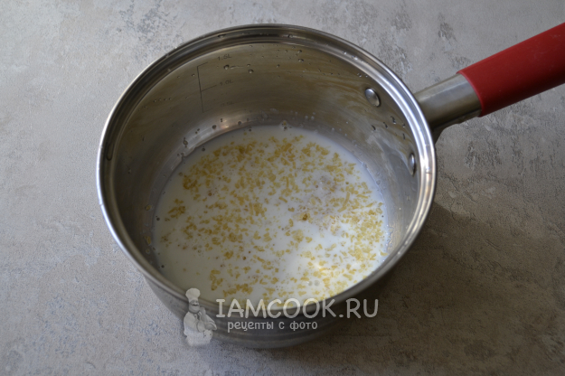 Влейте в сотейник молоко. Оставьте желатин для набухания в соответствии с инструкцией на упаковке.