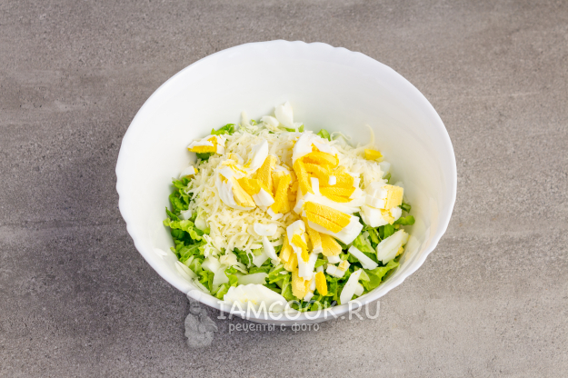 Положите в салатник капусту и сыр. А также нарезанные с помощью яйцерезки или ножа вареные яйца.