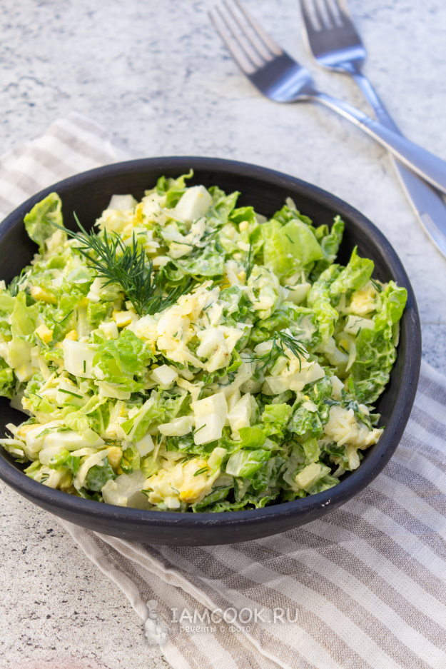 Салат из пекинской капусты с сыром и яйцом готов к употреблению! Настаивать такой салат не нужно, кушайте сразу после приготовления.