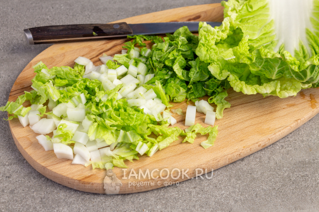 Листья пекинской капусты помойте, а затем нарежьте.