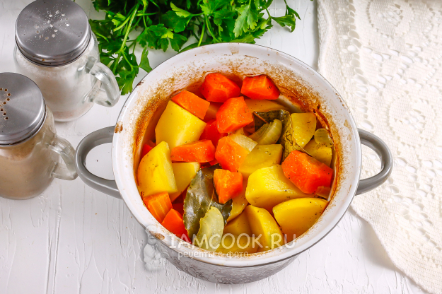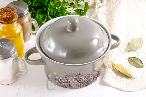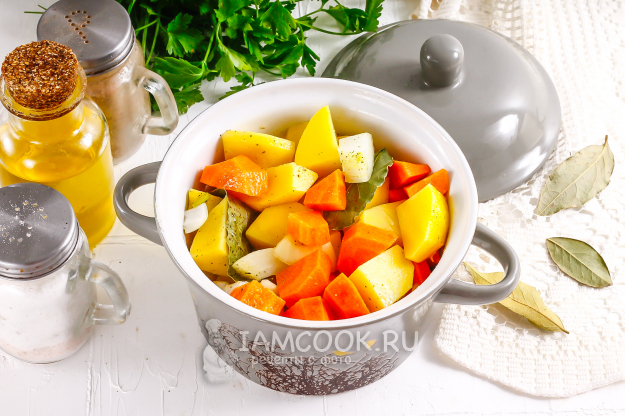 Выложите все нарезки в горшочек или горшочки, влейте горячую воду и растительное масло без аромата. Выложите лавровые листья.