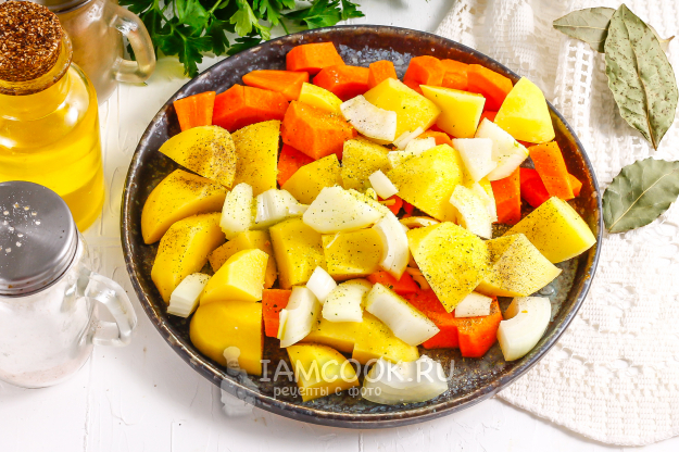 Посолите и поперчите, по желанию добавьте и другие приправы, пряности, специи. Разогрейте духовку до 200 градусов.
