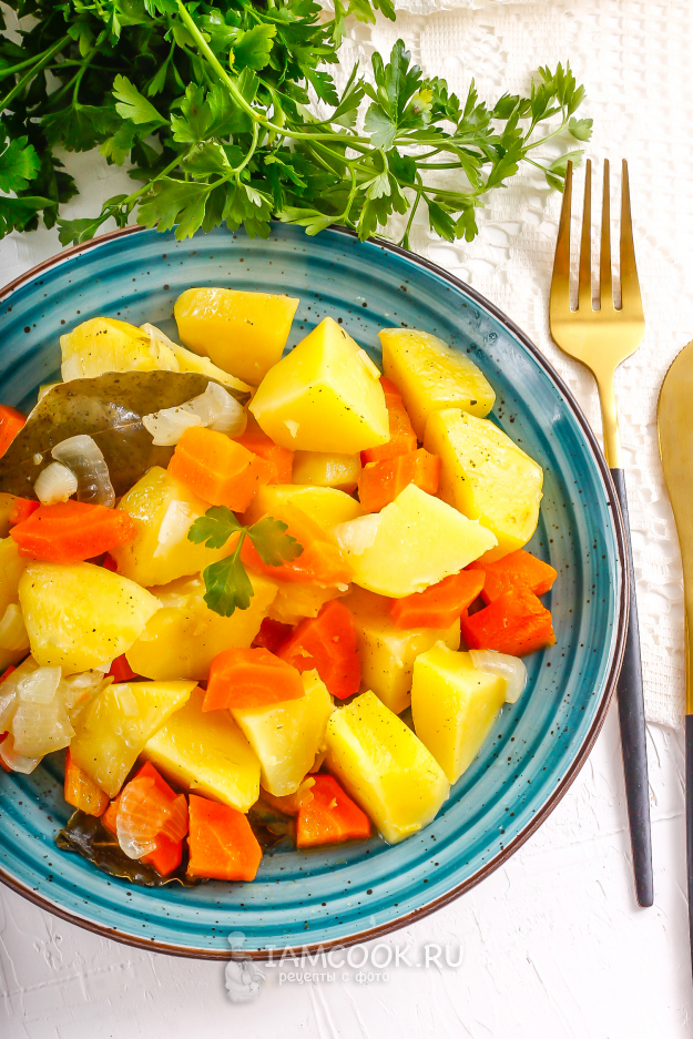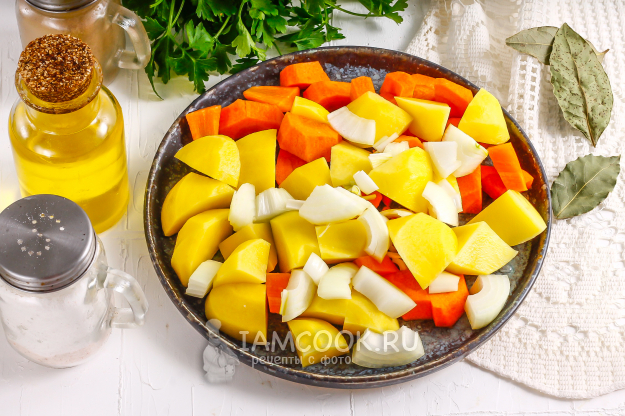Очистите картофель, морковь и лук от кожуры, промойте в воде. Нарежьте крупными или средними кубиками, так как для приготовления рагу используется именно такой способ нарезки.