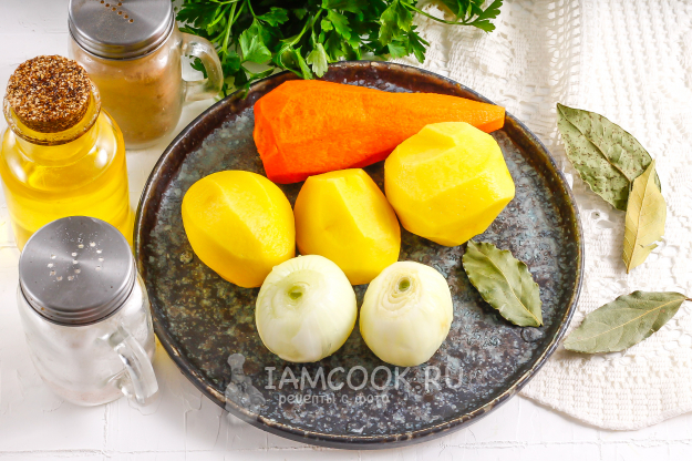 Возьмите необходимые ингредиенты для приготовления овощного рагу без мяса в горшочке в духовке.