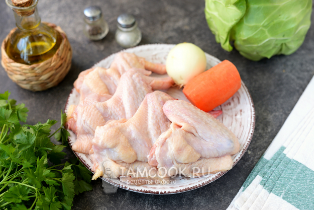 Возьмите все продукты для приготовления тушеной капусты с куриными крылышками. Крылышки помойте, обсушите, уберите остатки перьев, обсушите бумажным полотенцем. Лук и морковь почистите, помойте вместе с капустой и зеленью.