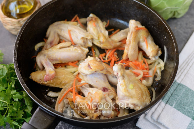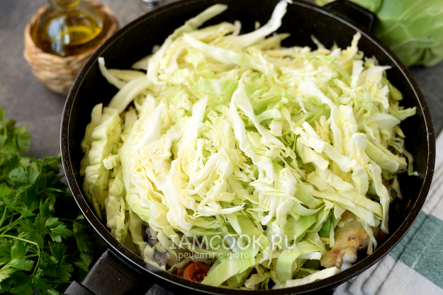 Когда лук с морковью станут мягкими, нашинкуйте молодую капусту, добавьте ее в сковороду, влейте немного теплой воды и тушите под крышкой минут 10-15. Время от времени перемешивайте капусту, чтобы она тушилась равномерно.
