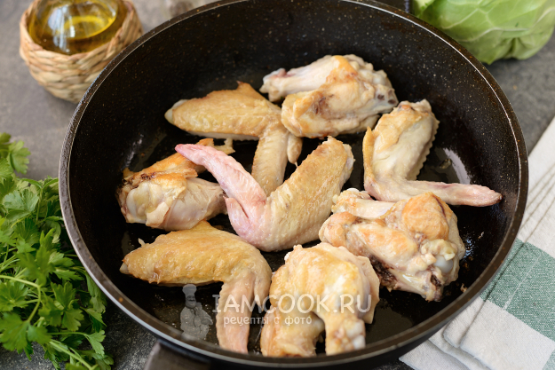 Каждое крылышко разрежьте пополам, выложите в разогретое в сковороде растительное масло, быстро обжарьте с обеих сторон до слегка румяной корочки.