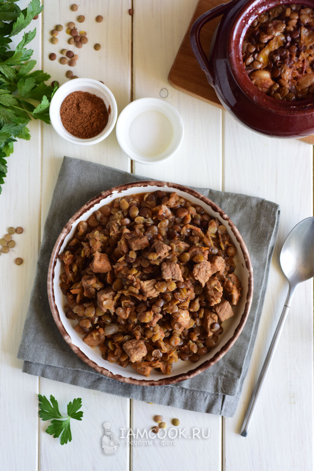 Готовую чечевицу с мясом выложим из горшочков на порционные тарелки и тут же подадим к столу. Приятного аппетита!