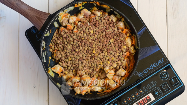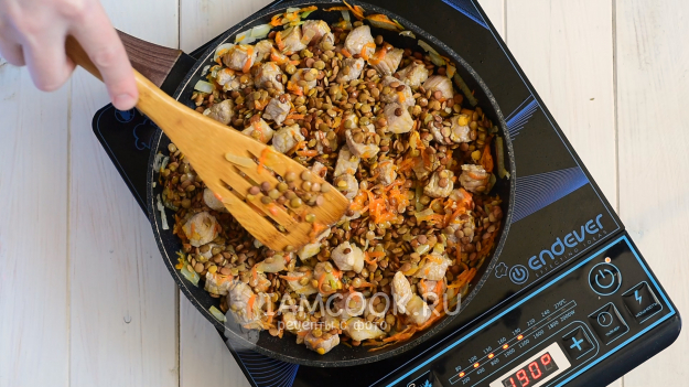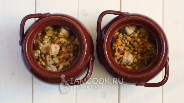 По горшочкам в равных количествах разложим чечевицу с мясом и овощами.