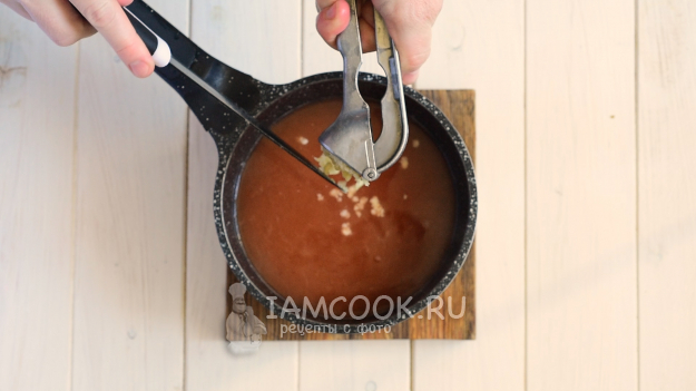 Через пресс выдавим чеснок и все еще раз перемешаем.