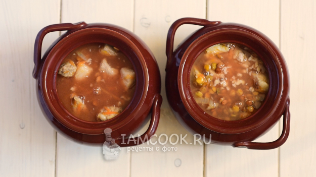 Зальем все приготовленным соусом. Горшочки закроем крышками и отправим в холодную духовку. Включим нагрев. Готовим чечевицу с мясом в горшочках в духовке примерно 40-45 минут при температуре 180-200 градусов.