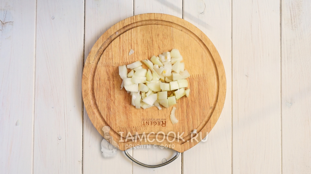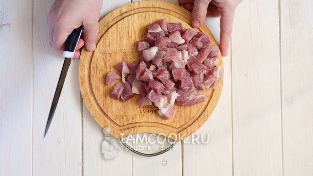 Мясо нарежем кубиками с размером стороны 1-1,5 см.