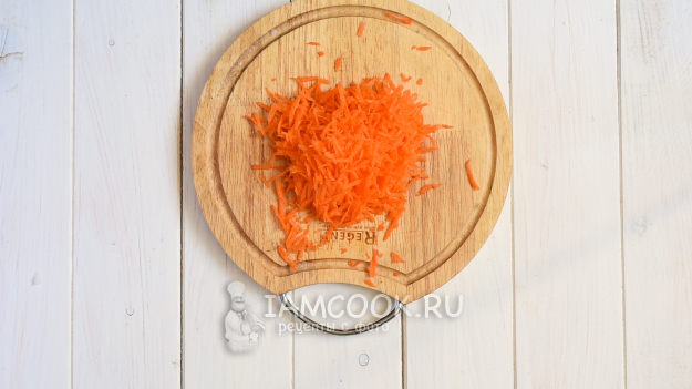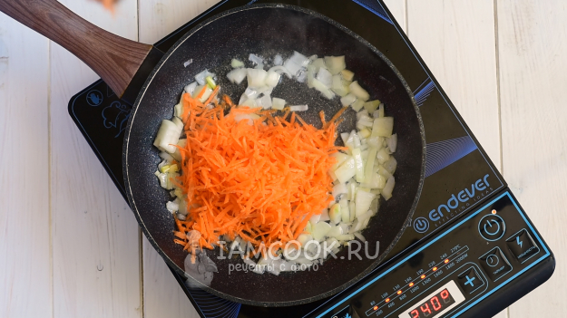 В сковороде разогреем на среднем огне растительное масло и выложим сначала измельченный лук, а затем и морковь. Обжаривать все будем постоянно помешивая лопаткой, до мягкости овощей.