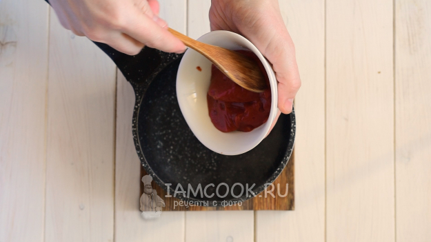 Приготовим соус. В сотейнике доведем до кипения указанное количество воды и выложим соус, добавим соль и специи. Перемешаем.