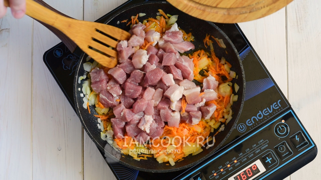 Выложим к овощам кусочки свинины и будем обжаривать все еще 10 минут, постоянно помешивая лопаткой.