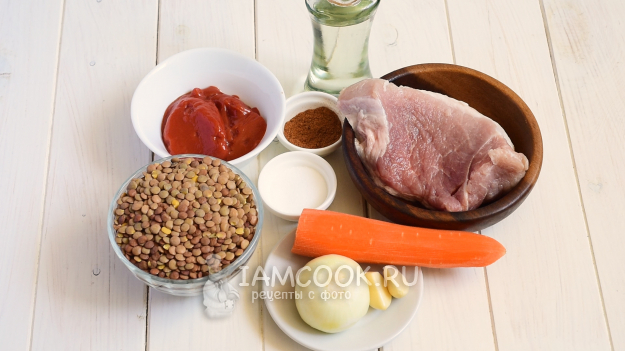 Возьмите необходимые ингредиенты для приготовления чечевицы с мясом в горшочке в духовке. Мясо ополоснем в проточной воде. Овощи почистим и помоем. Чеснок почистим.