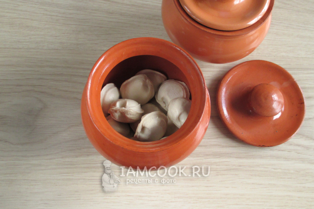 В смазанный маслом горшочек уложите пельмени. Пельмени могут быть уже готовыми, т.е. сваренными, или сырыми, т.е. прямо из морозилки. Мой вариант - с замороженными пельменями.