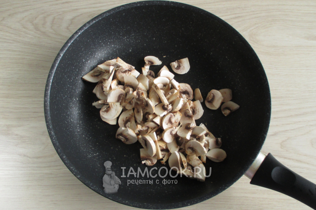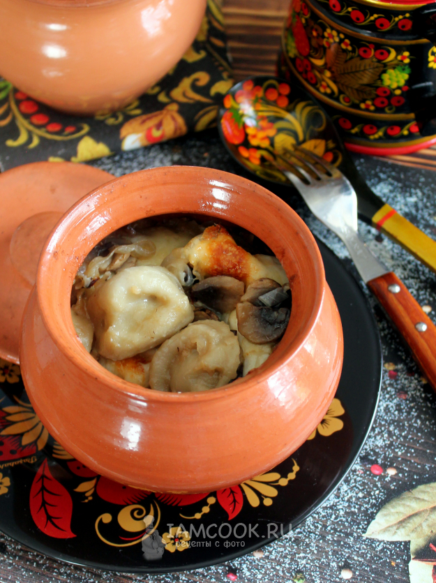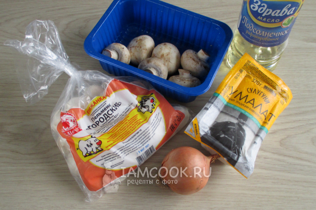 Возьмите ингредиенты для приготовления пельменей по-царски в горшочке (с грибами и сыром).