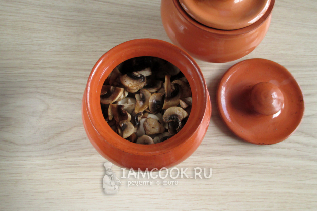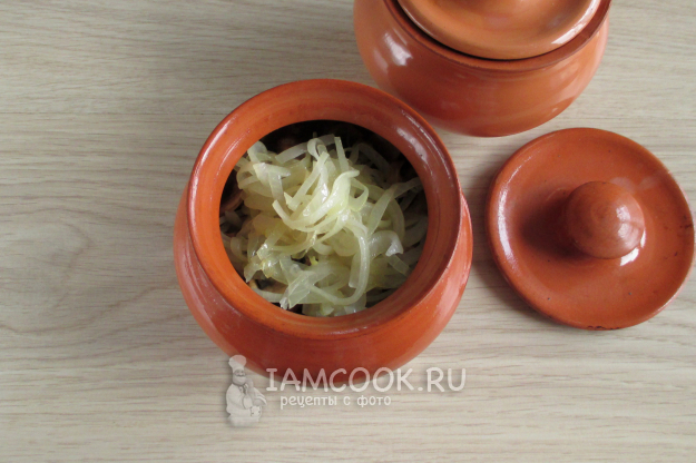 Затем – томленый (или жареный) лук. Влейте порцию воды (или смесь из воды и сметаны) и закройте горшочки крышечками или фольгой.